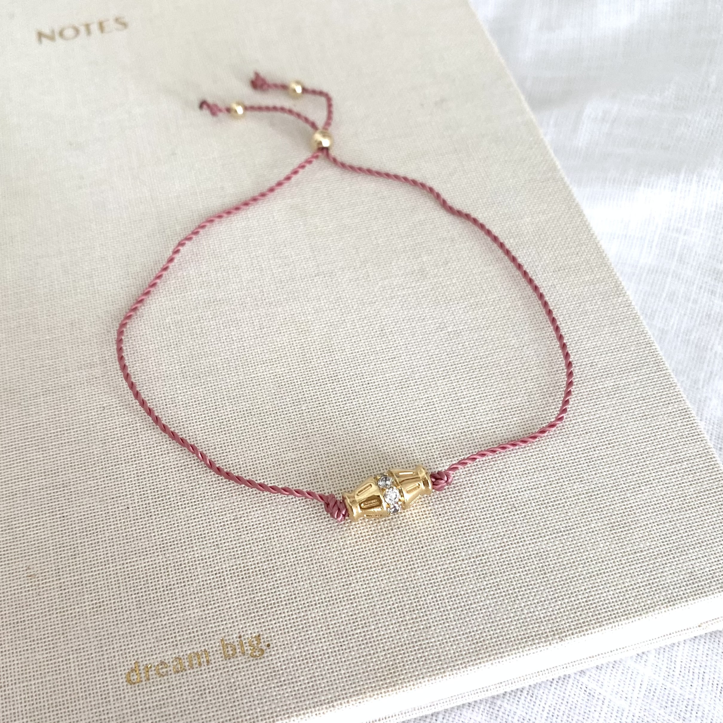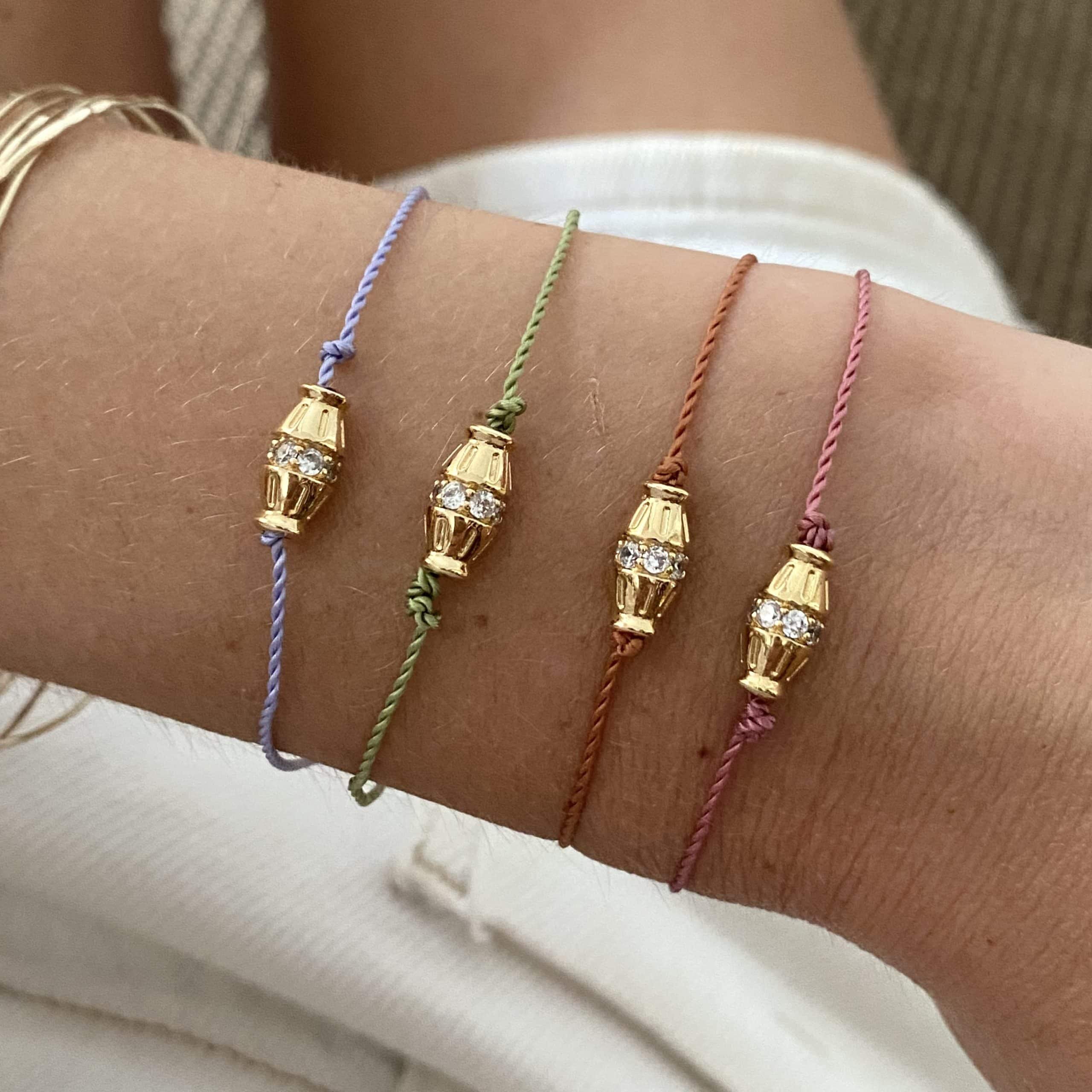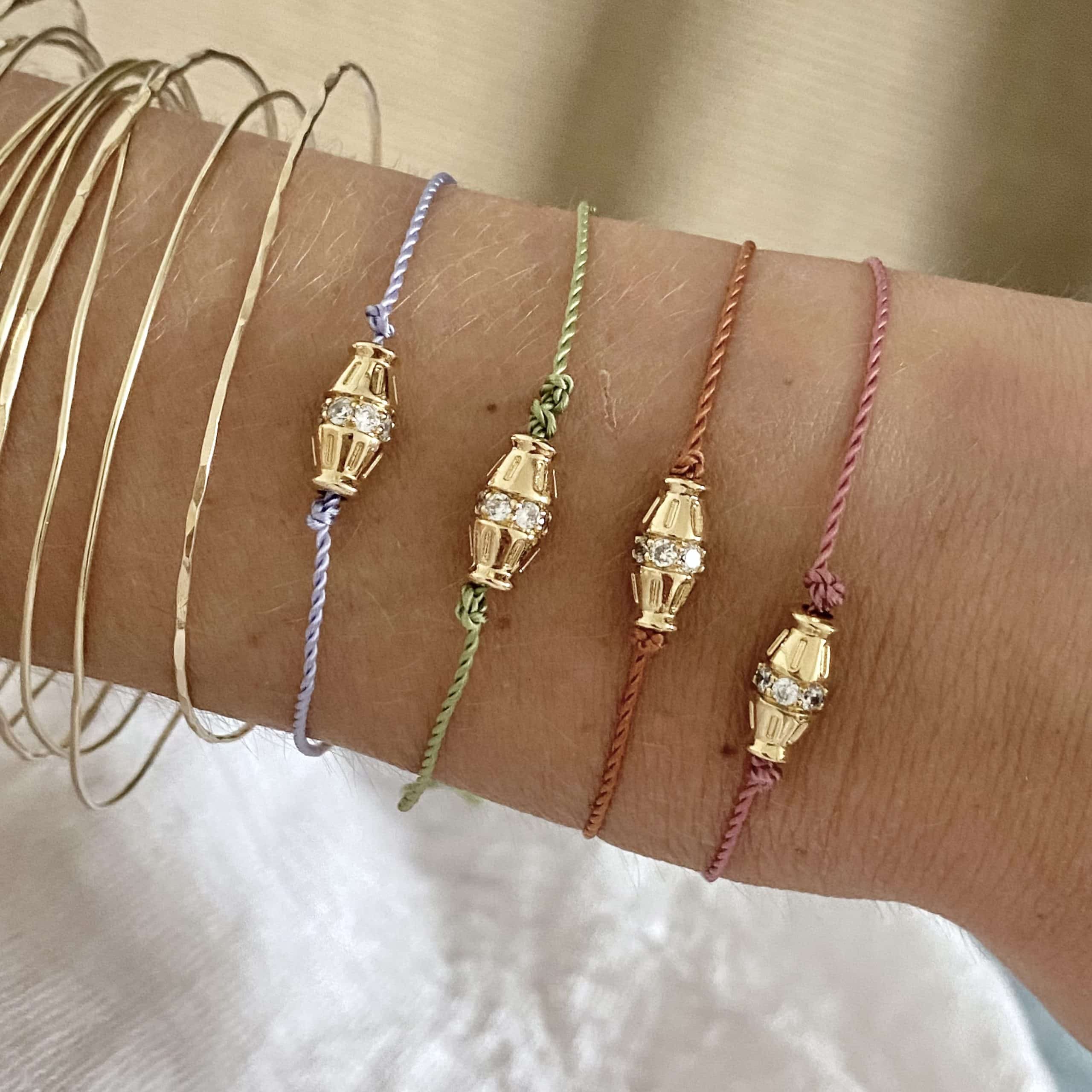 - Bracelet sur cordon en nylon torsadé, élément doré à l’or fin 3 microns et zirconiums